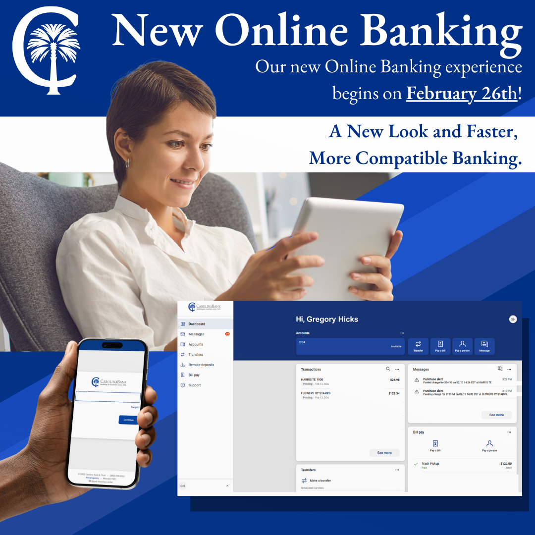 You asked, and we listened! Carolina Bank is excited to announce the launch of our new Online Banking experience. All of the essential banking features you've come to love now in a cleaner, simpler design. This transfer will be done during the morning on February 26th, 2025. We're excited, and we hope you are too! We'll be making more improvements in the online platform in the future as we strive to provide the latest in both financial technology and customer service. So, what's next?